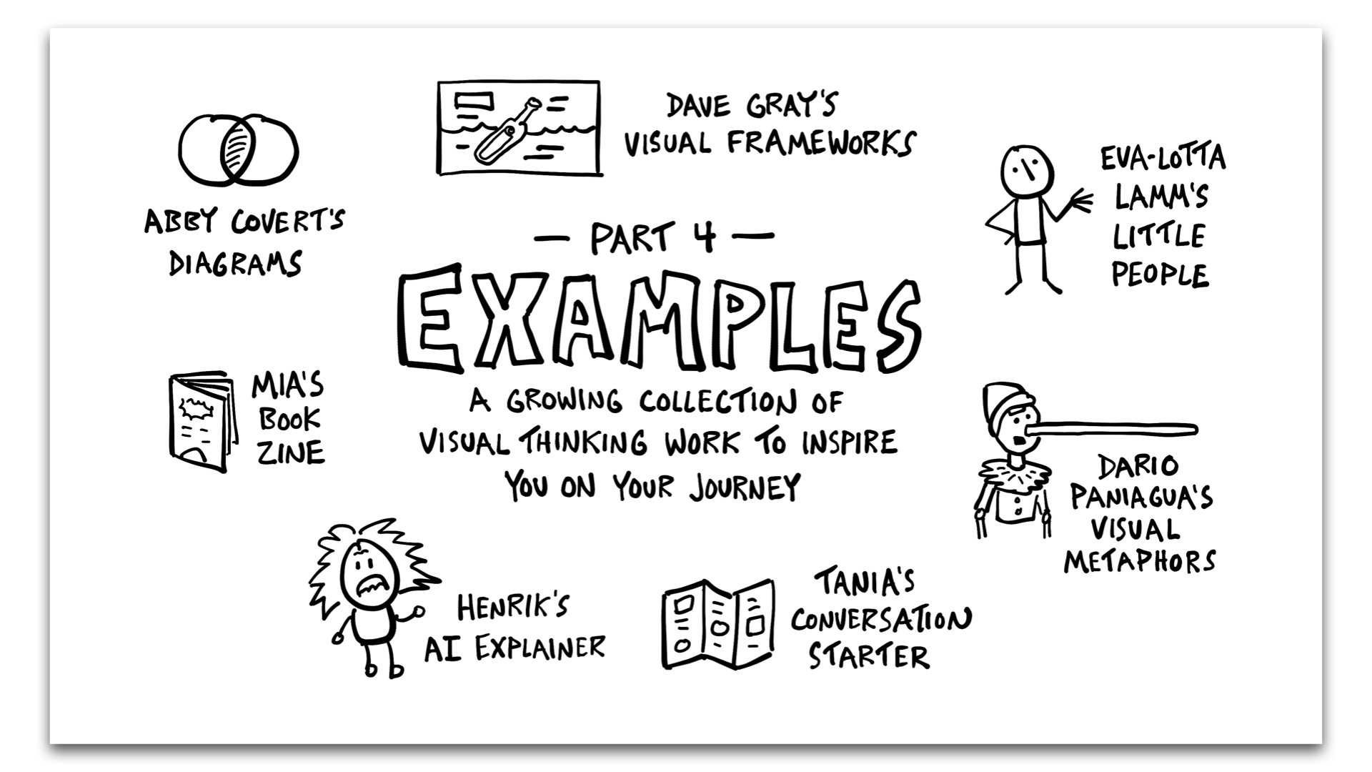 Get inspired by real visual thinking work from practitioners around the world. Study frameworks from experts like Dave Gray and Abby Covert, explore creative approaches from visual storytellers, and see how others within the community are using these skills in their professional and personal lives.