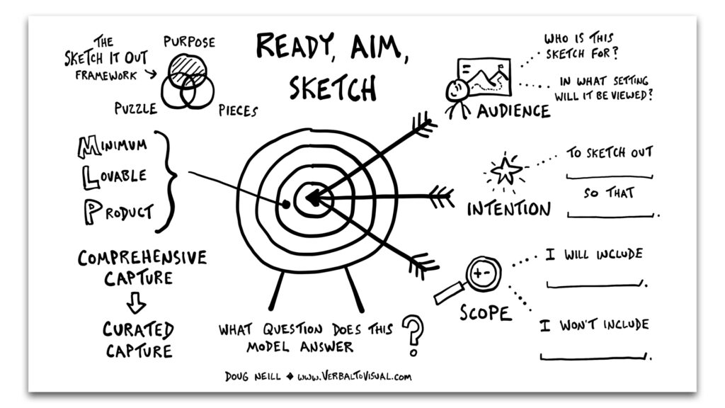 This approach is part of the Ready, Aim, Sketch model that I teach inĀ The Verbal to Visual Curriculum, where we explore all aspects of the visual thinking journey.